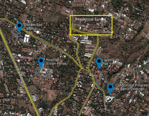 RESIDENCIAL EUROPA está situado al principio de la PRIMERA ETAPA de la Estancia de Santo Domingo y por tanto es el Condominio más próximo a las principales vías de acceso y comunicación con toda Managua, pero su especial ubicación le proporciona dos nuevos accesos directos al Camino Viejo de Santo Domingo y a la Carretera a Masaya, además de la entrada principalde la Primera Etapa de la Estancia.