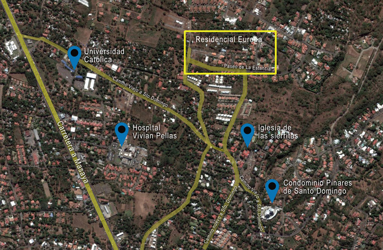 RESIDENCIAL EUROPA está situado al principio de la PRIMERA ETAPA de la Estancia de Santo Domingo y por tanto es el Condominio más próximo a las principales vías de acceso y comunicación con toda Managua, pero su especial ubicación le proporciona dos nuevos accesos directos al Camino Viejo de Santo Domingo y a la Carretera a Masaya, además de la entrada principalde la Primera Etapa de la Estancia.